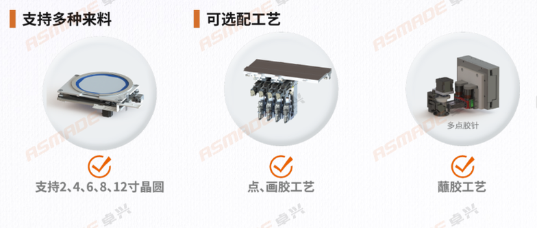 The semiconductor silver epoxy die attach machine supports various sizes of blue film feeding, including 2/4/6/8/12-inch wafers, with automatic film expansion for 12-inch wafers. It supports single 6-inch mother-daughter rings, Waffle Pack, and GelPAK, and tray customization is available based on specific requirements.